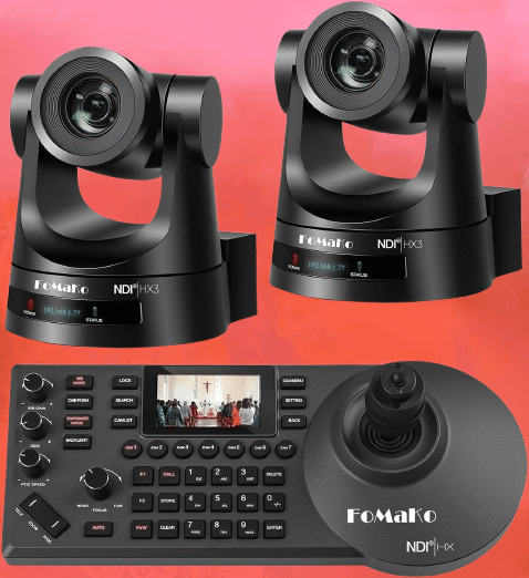 - Deux (2) caméras FoMaKo 20X Zoom NDI PTZ avec capteur CMOS 1/2.8″ et 2,07 mégapixels
